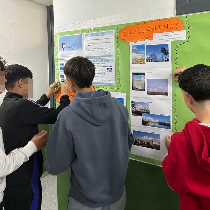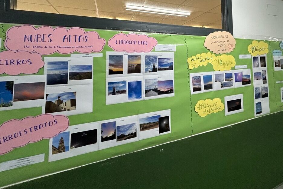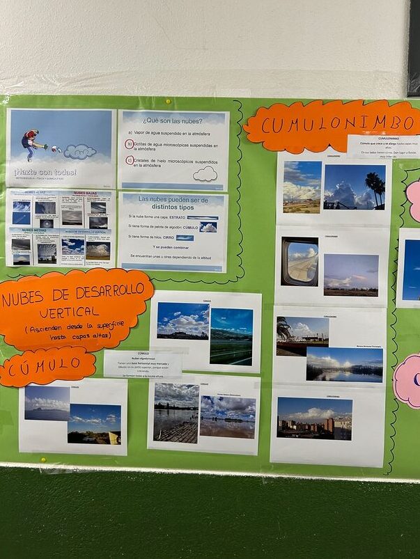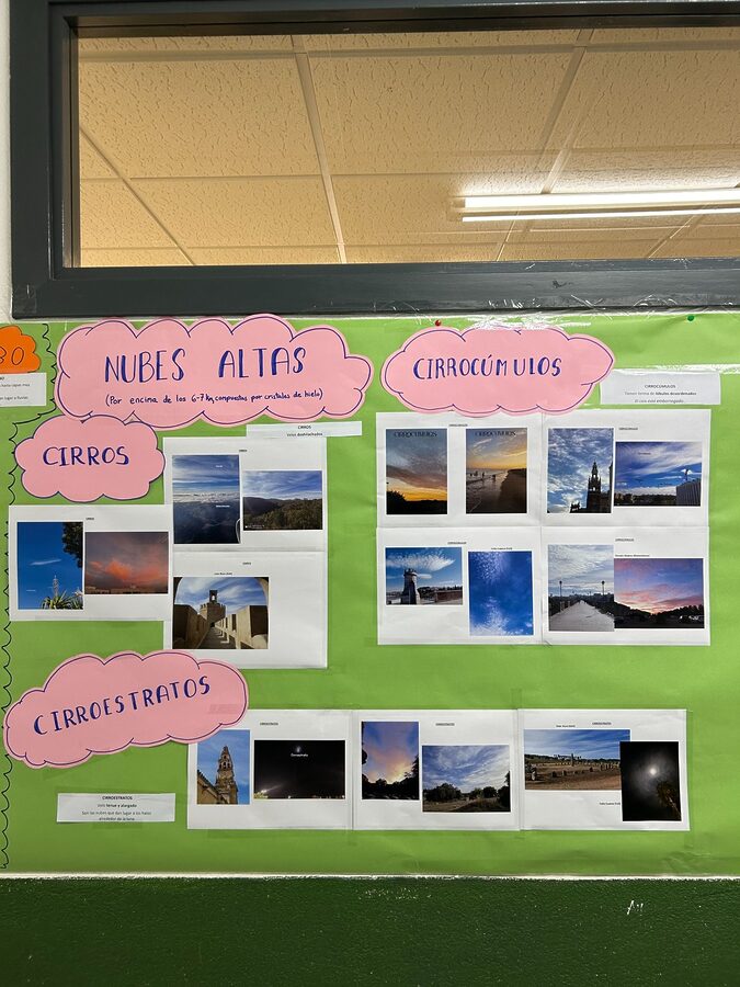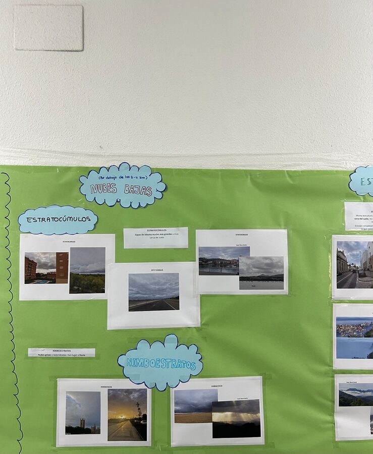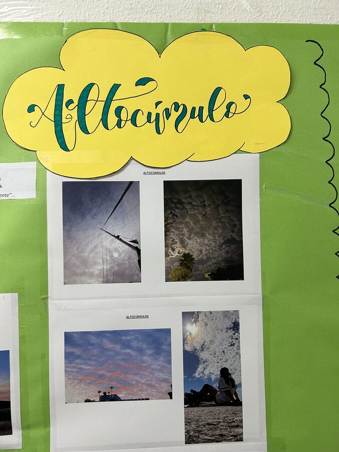 Con el resto de fotografías, el grupo elaboró en clase un atlas de nubes, un trabajo que ocupó cuatro sesiones. Se seleccionaron las imágenes más representativas y estéticamente atractivas, asegurando que cada estudiante tuviera al menos dos fotografías incluidas. También se incorporaron fotos tomadas por otros docentes del centro que las enviaron de manera voluntaria. Con todo el material recopilado, se montó un atlas en el pasillo superior del instituto, acompañado de la descripción de cada tipo de nube y las fotografías correspondientes.