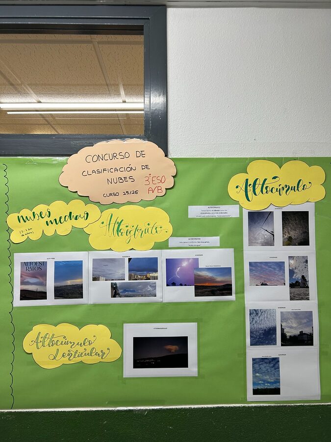 El alumnado de 3.º ESO A/B bilingüe ha participado en un proyecto titulado “Concurso de clasificación de nubes”, desarrollado en la asignatura de Física y Química y enmarcado en el programa Meteoescuela. La actividad comenzó con un par de sesiones en las que la docente explicó cómo clasificar las nubes según su forma y su altura.